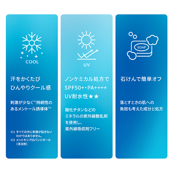 刺激が少ない*1メントール誘導体*2配合、紫外線吸収剤フリーで、パサつきやきしみのないみずみずしいウォーターベースです。