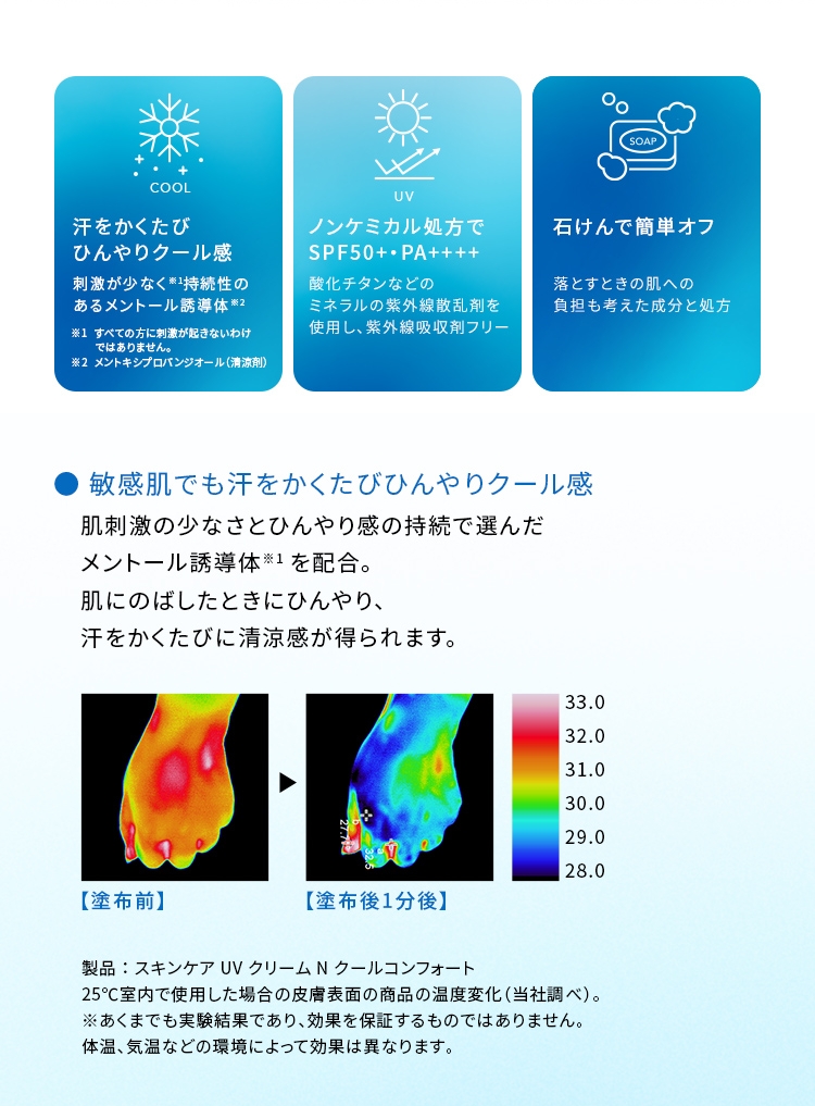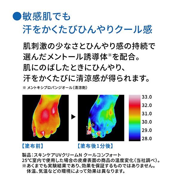 肌刺激の少なさとひんやり感の持続で選んだメントール誘導体*2を配合。
