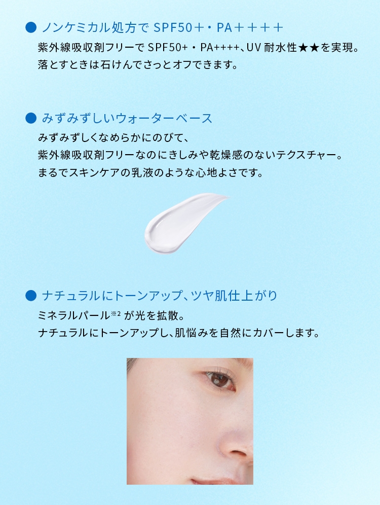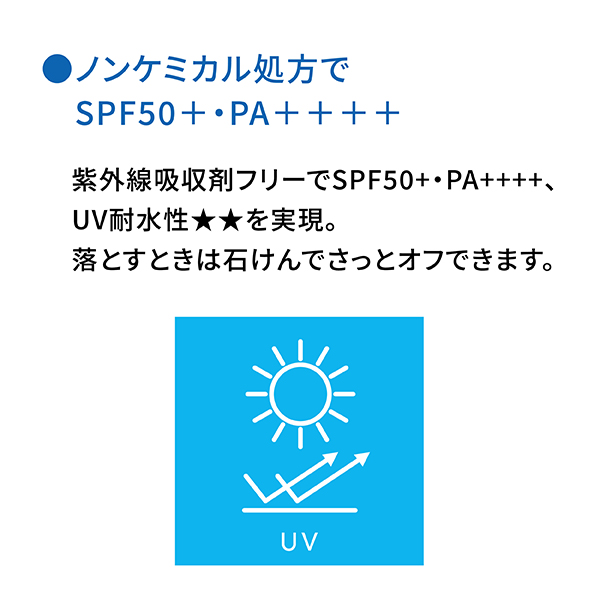 紫外線吸収剤フリーでSPF50+・PA++++、UV耐水性★★を実現。