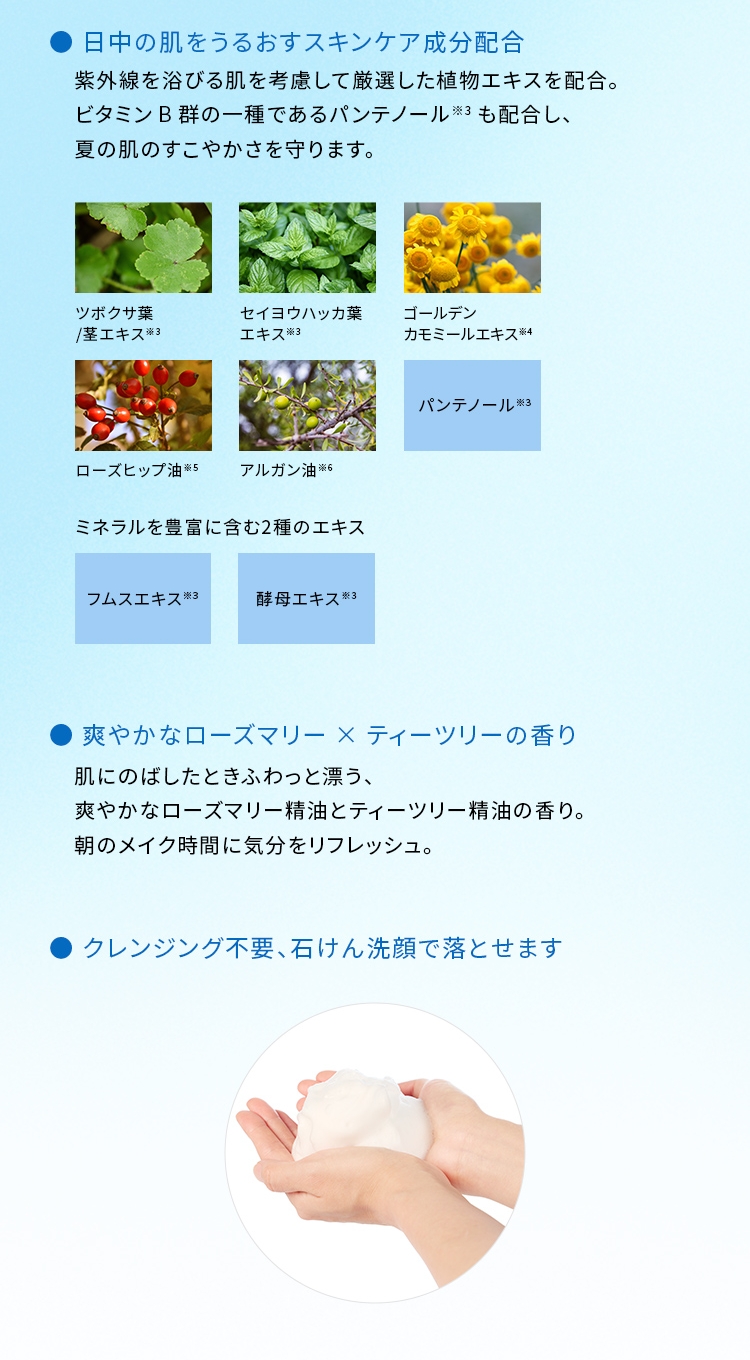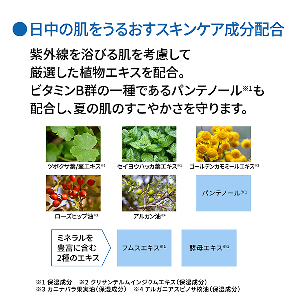 ビタミンB群の一種であるパンテノール*6も配合し、夏の肌のすこやかさを守ります。