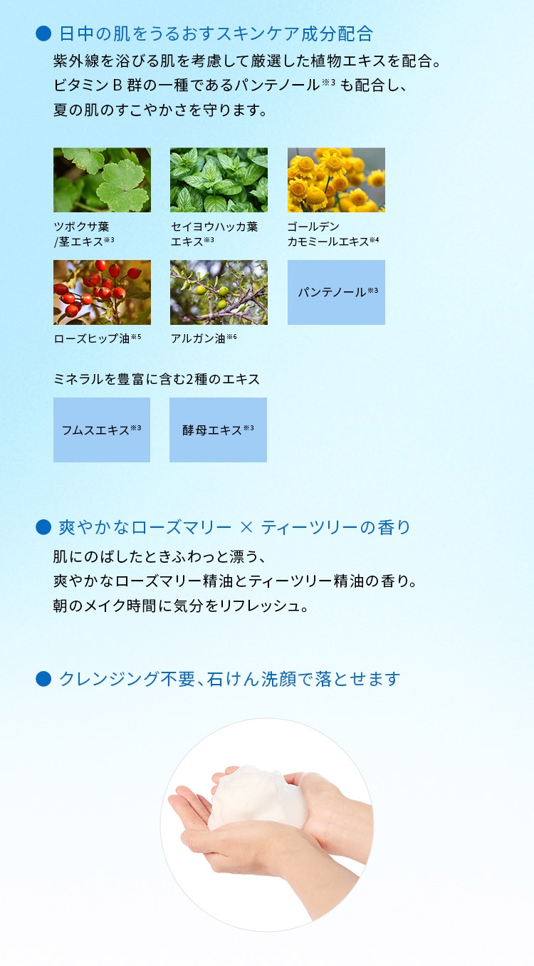 炭酸Ca*5のさらっとした感触でテカりを抑えながら、5種のセラミド*6、スクワランなどの保湿成分が日中の乾燥から肌を守りうるおいキープ。