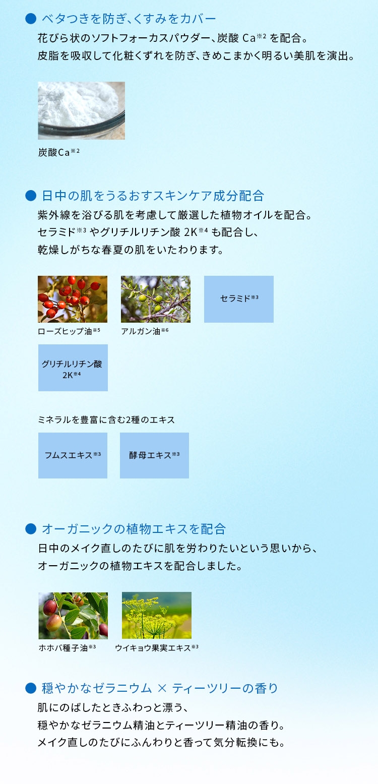 紫外線吸収剤フリーの肌にやさしいパウダーで、一日中快適に過ごせます。