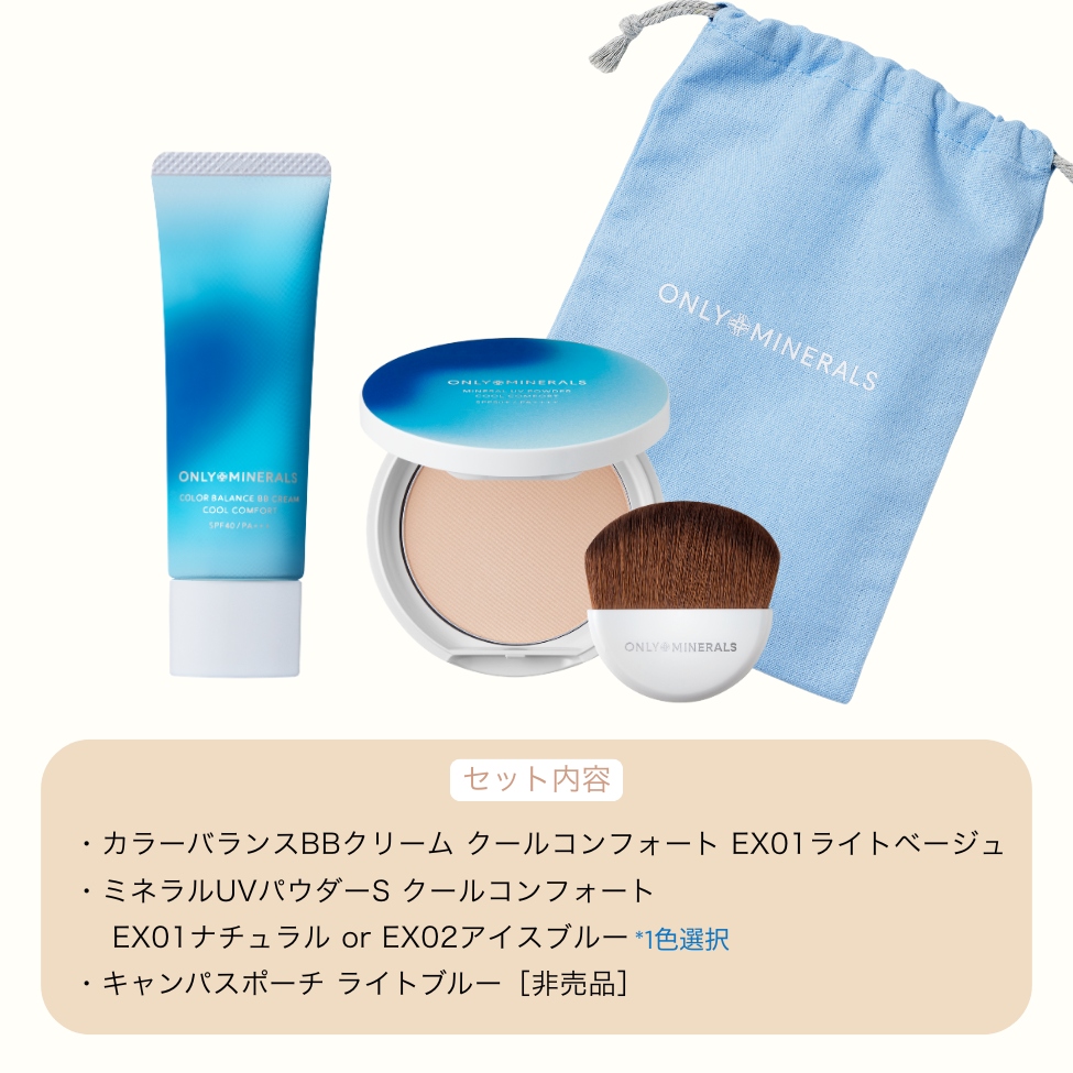 肌トーンを補整する冷感BBクリームと冷感UVパウダーがセットに。巾着型のポーチつき。