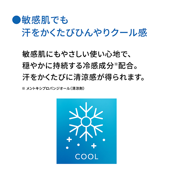 刺激が少ない*1メントール誘導体*2配合で心地よさが持続し、汗をかくたびひんやり感が戻ります。
