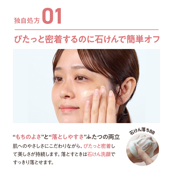 ノンシリコンかつ石けんで落とせる処方でありながら、ぴたっと密着しメイク後の美しさが持続するBBクリーム。