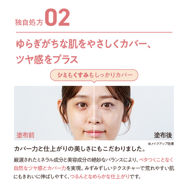 厳選されたミネラル成分と美容成分の絶妙なバランスにより、ベタつくことなく自然なツヤと高いカバー力を叶えます。