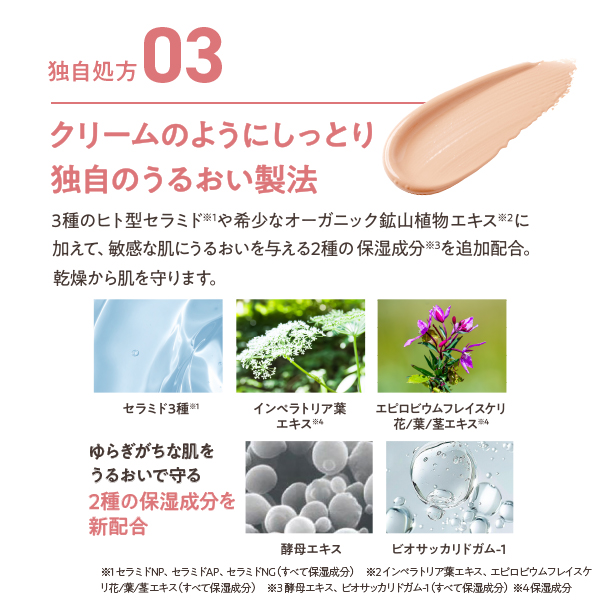 3種のヒト型セラミド*2や希少なオーガニック鉱山植物エキス*3に加えて、敏感な肌にうるおいを与える2種の保湿成分「酵母エキス」「ビオサッカリドガム-1」を追加配合。