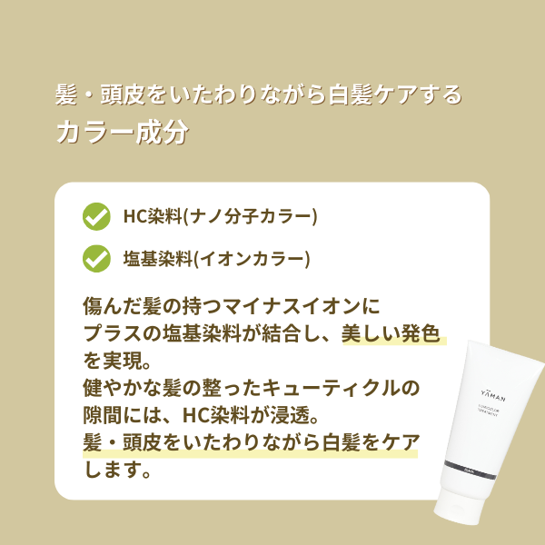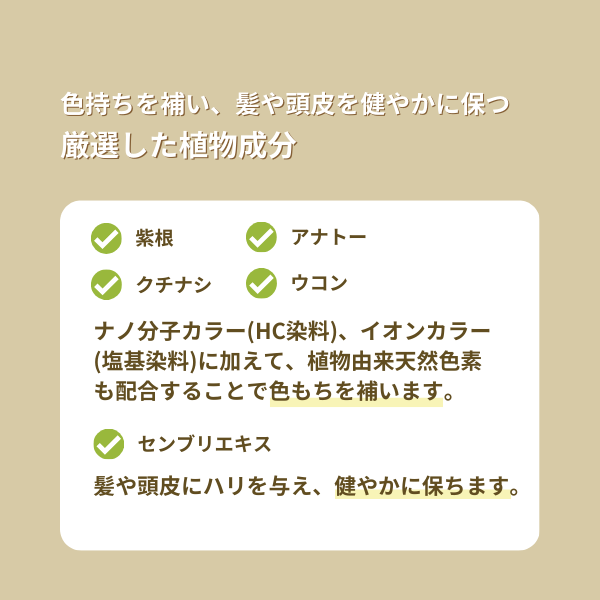 水、ベヘニルアルコール、BG、パルミチン酸エチルヘキシル、ステアラミドプロピルジメチルアミン、ミリスチルアルコール、ステアリン酸、加水分解ケラチン( 羊毛)、オタネニンジン根エキス、センブリエキス、加水分解シルク、グリチルリチン酸2K、マロン酸ビスエチルヘキシルヒドロキシジメトキシベンジル、PEG- 40水添ヒマシ油、ステアリン酸グリセリル、ポリクオタニウム-10、バチルアルコール、ミリスチン酸、水添ヤシ油、PPG-3カプリリルエーテル、イノシトール、 トコフェロール、パーシック油、ミツロウ、ポリアミノプロピルビグアニド、エタノール、フェノキシエタノール、ウコン根茎エキス、水溶性アナトー、ムラサキ 根エキス、HC青2、HC黄4、4-ヒドロキシプロピルアミノ-3-ニトロフェノール、塩基性青99、塩基性茶16、塩基性黄57、塩基性赤76