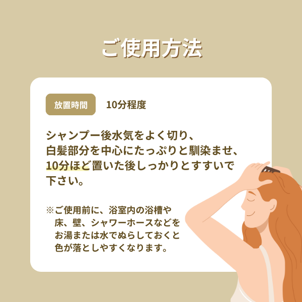 シャンプー後水気をよく切り、白髪部分を中心にたっぷりと馴染ませ、10分ほど置いた後しっかりとすすいで下さい。