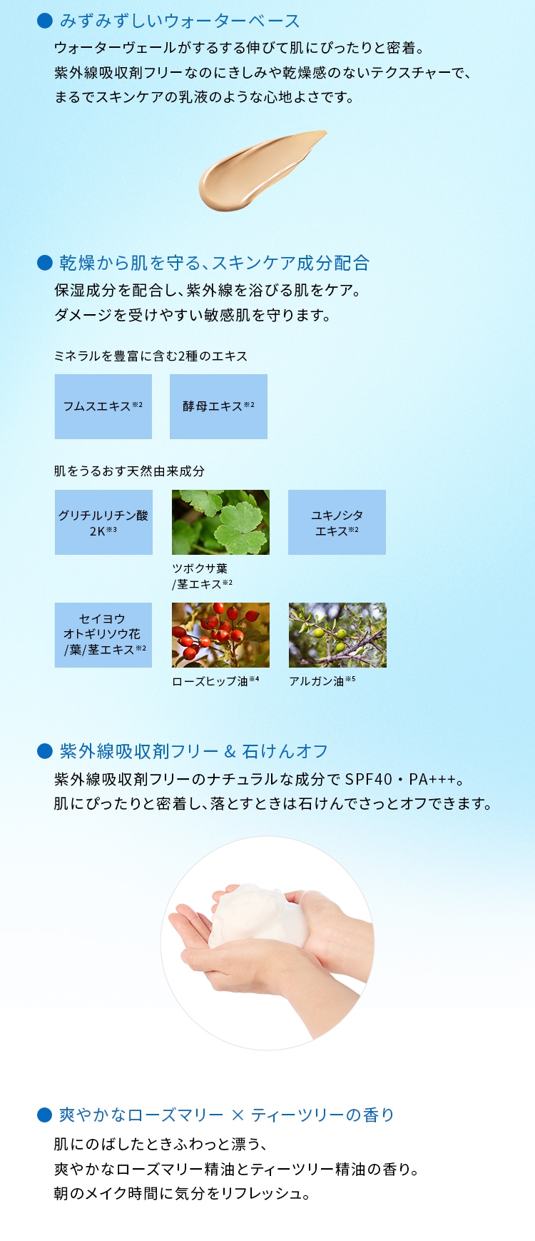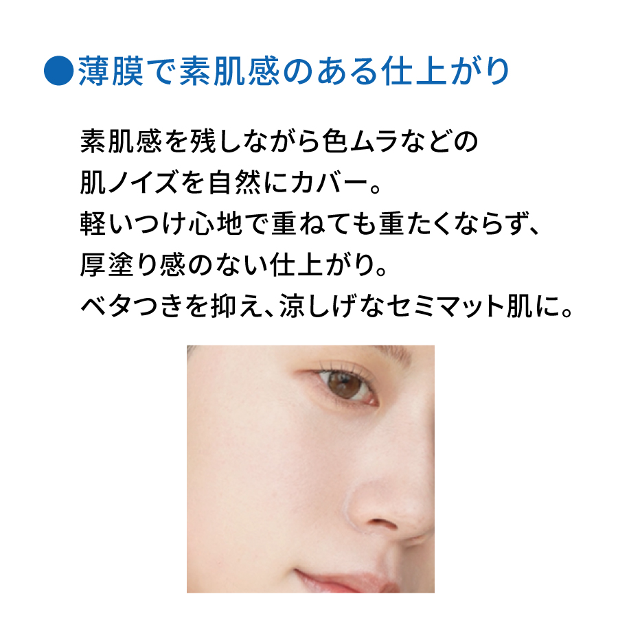 紫外線をしっかりカットしながら贅沢に配合された保湿成分が日中の乾燥から肌を守り、汗や皮脂にも崩れにくく、涼しげなセミマット肌をキープします。