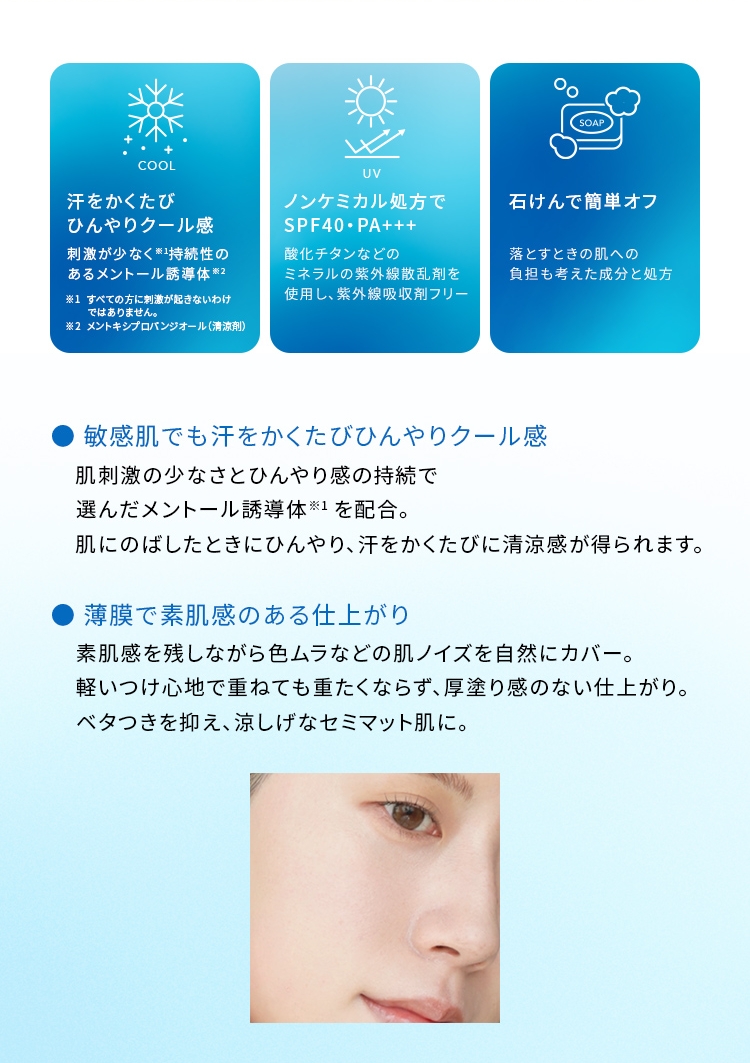 刺激が少ない*1メントール誘導体*2配合、紫外線吸収剤フリーで、パサつきやきしみの少ないウォーターベース。