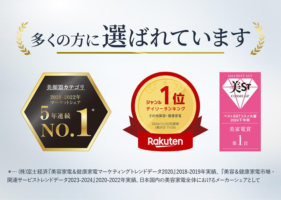 ●途中で気分が悪くなったり肌に異常があらわれた場合は、ただちに使用を中止し、治らない場合は医師に相談する ※より多くのお客様に製品を使用していただけるよう2021年12月1日より安全に関する使用者、使用部位、使用状態に関しての制限を一部緩和しました。 順次切り替えを行っていきますが、一部製品に同梱されている取扱説明書や、webサイト上のデータに相違がある場合がございます。ご理解のほどよろしくお願いします。
