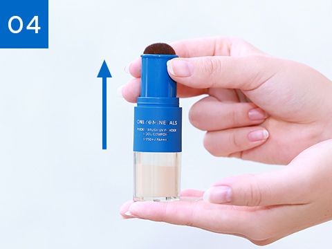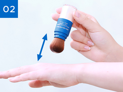 ブラシの先にパウダーが出てくるまで、手の甲、またはティッシュペーパー等にブラシを軽くトントンとたたき、十分にブラシにパウダーを含ませます。
