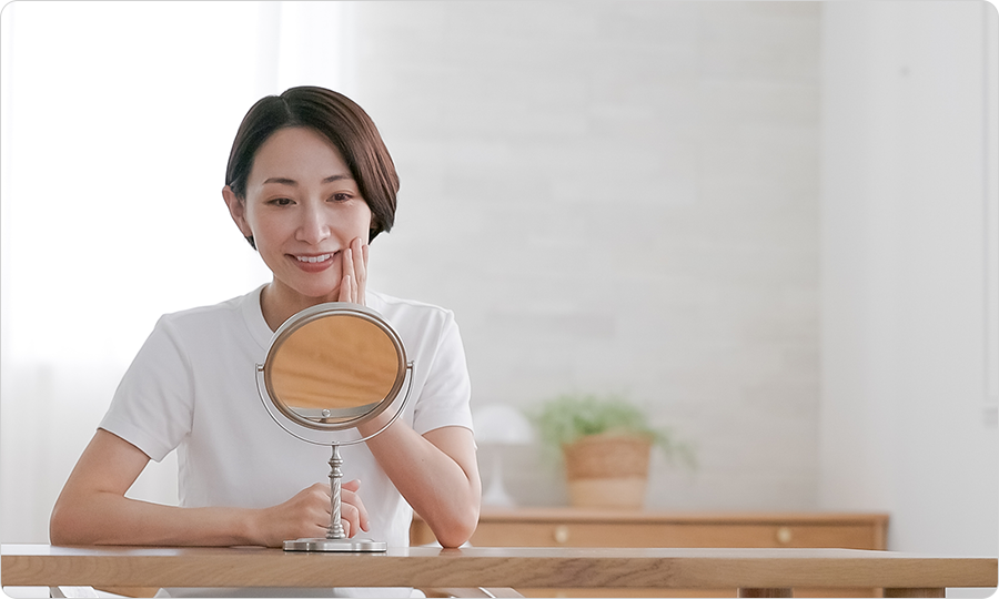 「年齢を重ねるほど『鏡をあまり見なくなりました』という人が増えてきます。つい若い頃の自分と比較してしまいますが、今日は人生で一番若い日。毎日、自分の肌の状態を見て、つや感や肌のハリなどをチェックしましょう。今、エイジングサインが気になっても、自分に合ったスキンケアは肌を着実に変えてくれます。その変化を実感するためにも、鏡を見る習慣を」