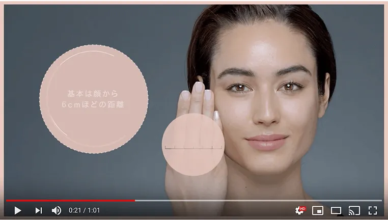 顔全体にスプレーするときも、コンシーラー使いするときも、本体を立てた状態でスプレーしてください。本体を傾けてスプレーすると、均一に噴霧することができません。